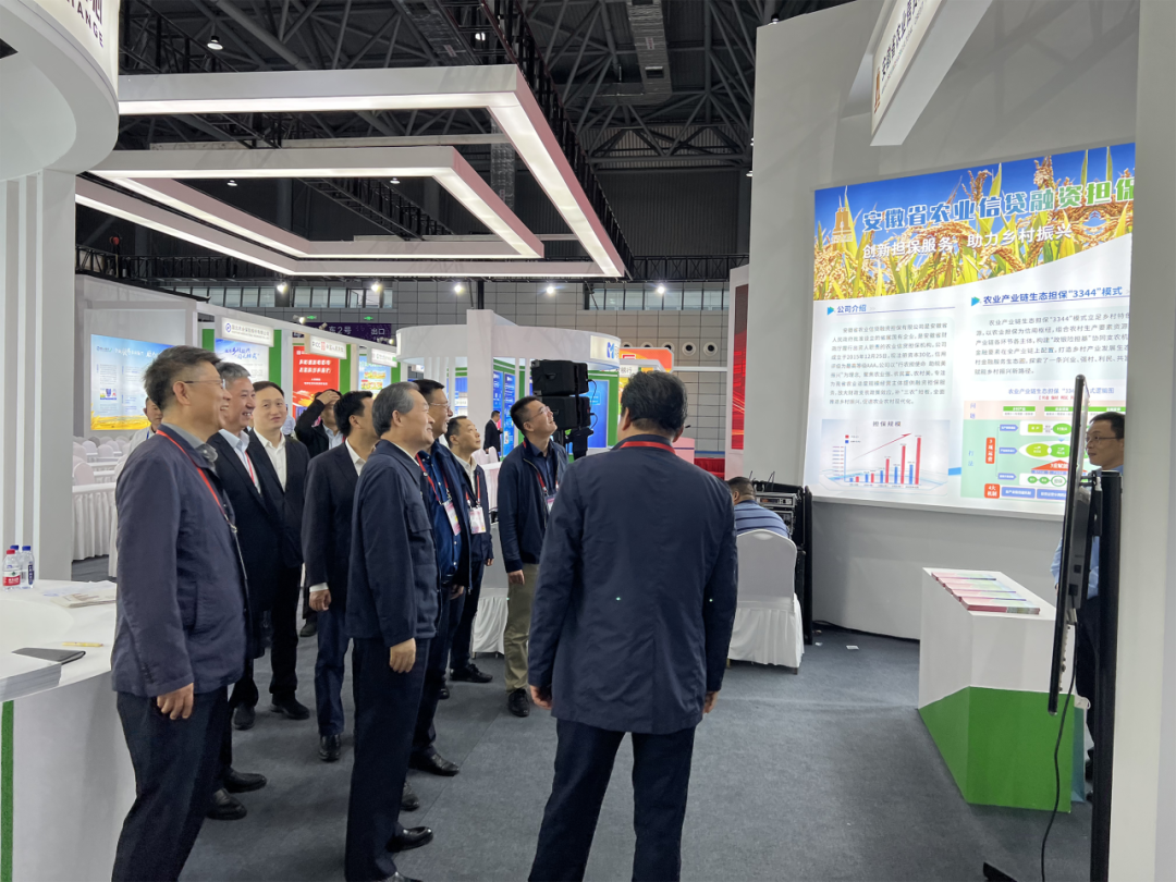安徽省副省长张曙光到金融展厅进行展前巡馆,在安徽农担展位前驻足并察看农业信贷担保服务乡村振兴工作情况