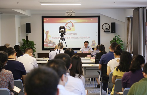讲党课,促提升。活动第三项,党委书记以《加强制度自信 把党的制度优势更好转化为公司治理优势》为题,讲授了一堂主题鲜明、内容丰富的“七一”党课。围绕加强制度自信,从历史到现实、理论到实践、国家层面到公司层面多个维度,重点讲解了三个方面的制度优势:一是中国特色社会主义的制度优势。围绕《中共中央关于坚持和完善中国特色社会主义制度、推进国家治理体系和治理能力现代化若干重大问题的决定》,着重阐述了对于坚持党的领导、集中力量办大事、以人民为中心三大显著优势的理解和认识。二是政策性农业信贷担保的制度优势。政策性农业信贷担保作为一项具有中国特色的开创性工作,实现了重大制度创新,彰显了显著的制度优势和政策效能。公司成立四年来,切实发挥“龙头”引领作用,建立了“紧密可控”的全国性三级体系框架;发挥“总部”功能,放大了财政支农政策效能;发挥政策性农担职能作用,在推进实施乡村振兴战略、助力脱贫攻坚进程中贡献了农担智慧与力量。三是国企党建的制度优势。坚持党的领导、加强党的建设,是我国国有企业的光荣传统,也是独特优势。公司成立四年来,坚持把党的领导融入公司治理体系,打造适合公司特点的党建工作模式,发挥了党组织的把关定向作用;坚持以党的建设助推公司中心工作,把抓党建、强党建落实到与公司经营管理的深度融合上、落实到提高公司发展的核心竞争力上,有效汇聚了事业发展动能。张洪武同志希望公司全体党员深入学习贯彻习近平新时代中国特色社会主义思想,更加自觉地思考并实践把中国制度优势更好转化为国家治理效能、把农担政策及体系优势更好转化为农担事业的发展优势、把党的制度优势更好转化为推动公司持续健康发展的治理优势。