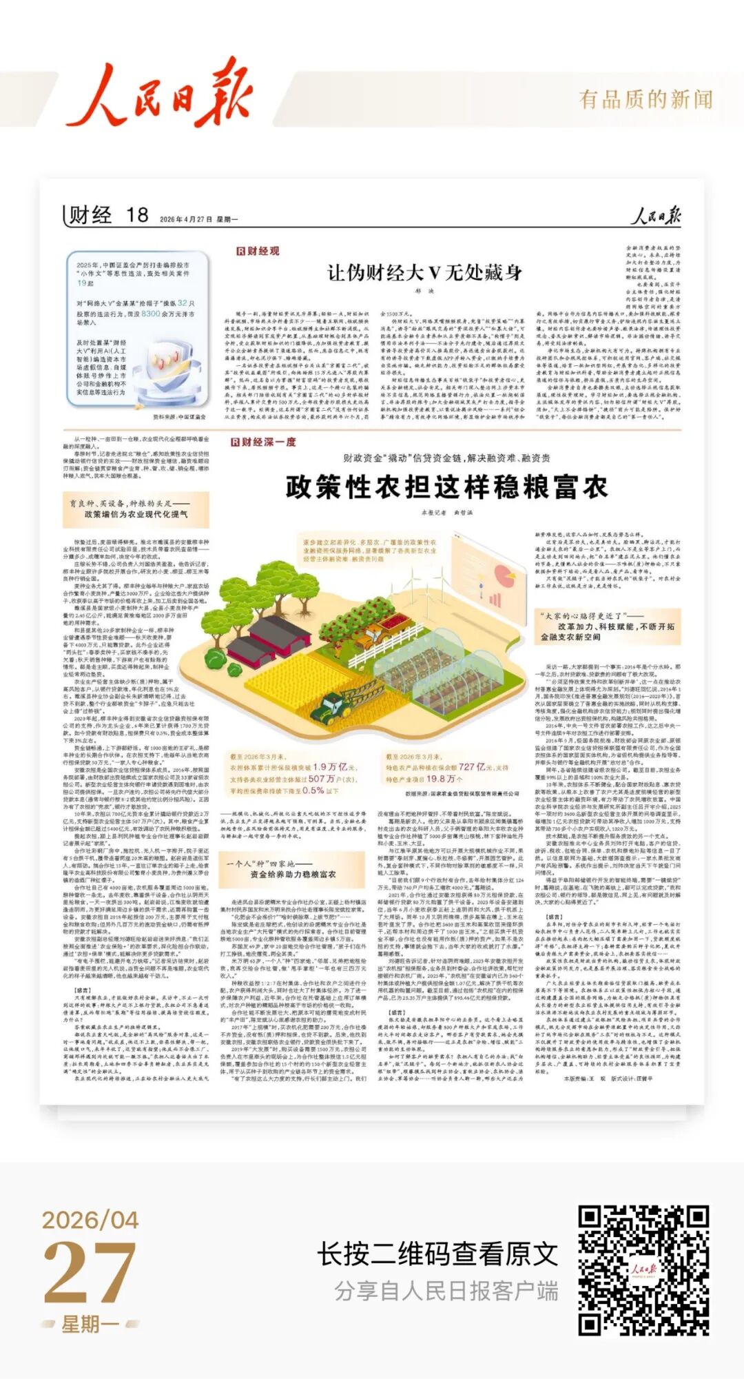 在全国农担体系成立十周年重要节点,《人民日报》头版今日(4月27日)重点导读、财经版专题聚焦《政策性农担这样稳粮富农》,深度报道政策性农担初心使命、履职成效与助农担当,生动展现了财政担保“四两拨千斤”的杠杆效应。